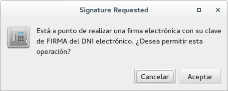 A continuación, el proceso es similar a como se configura la firma con claves GPG, con el lector de tarjetas inteligentes conectado al equipo y el DNI electrónico introducido accedemos a las propiedades de la cuenta, a la sección seguridad y en el apartado MIME seguro (S/MIME) seleccionamos nuestro certificado. Si queremos que nuestros mensajes se firmen automaticamente debemos marcar la opción «Firmar siempre los mensajes salientes cuando se use esta cuenta». Habiendo ejecutado el comando modutil cuando pulsemos el botón seleccionar en el apartado S/MIME se nos solicitará el PIN secreto de nuestro DNIe.