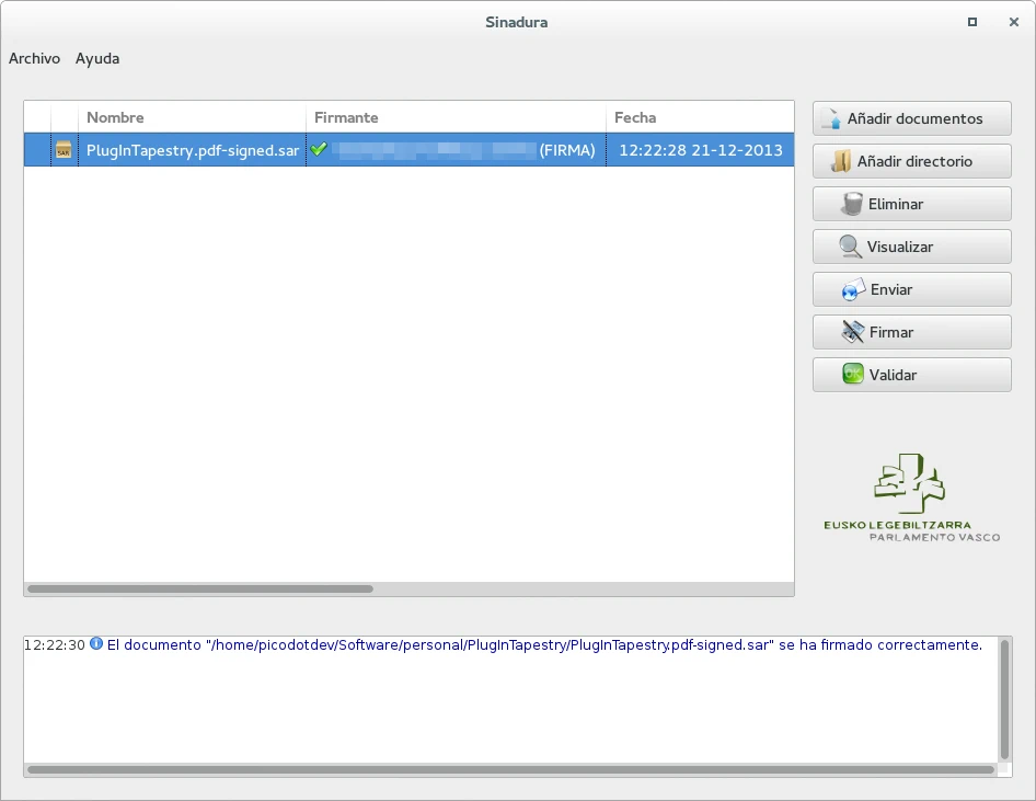 Una vez firmados los archivos podemos enviarlos por correo electrónico y la persona que los reciba podrá validarlos también con Sinadura. Para ello se debe añadir el archivo y pulsar el botón «Validar».