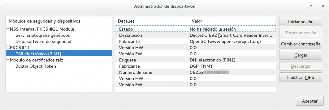 Pulsamos «Aceptar», salimos del diálogo «Dispositivos de seguridad» y reiniciamos Firefox. Para que Firefox reconozca el lector junto con el DNIe este debe estar introducido al iniciarlo sino no se nos aparecerá el diálogo solicitando el PIN del DNIe en el momento de la autenticación y no podremos usarlo, esto es así posiblemente por algún tipo de circunstancia que impide detectar el DNIe en el momento de introducirlo en Firefox, sabiéndolo no supone mayor problema. Por lo demás, esa es toda la configuración adicional necesaria para usar el DNIe con Firefox.