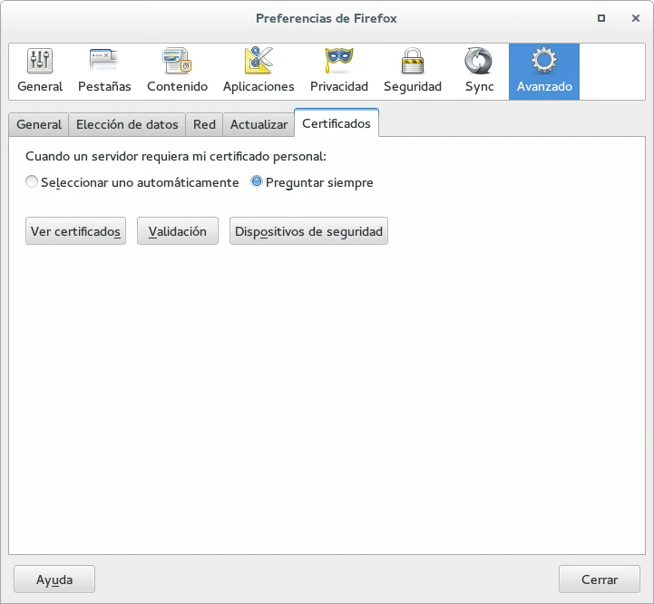 En esta entrada explicaré como usar el DNIe electrónico con la combinación del navegador Firefox y Linux. Para ello primeramente debemos hacer que Firefox detecte el lector de tarjetas inteligentes, desde el menú de Firefox vamos a «Preferencias> Avanzado> Certificados> Dispositivos de seguridad».