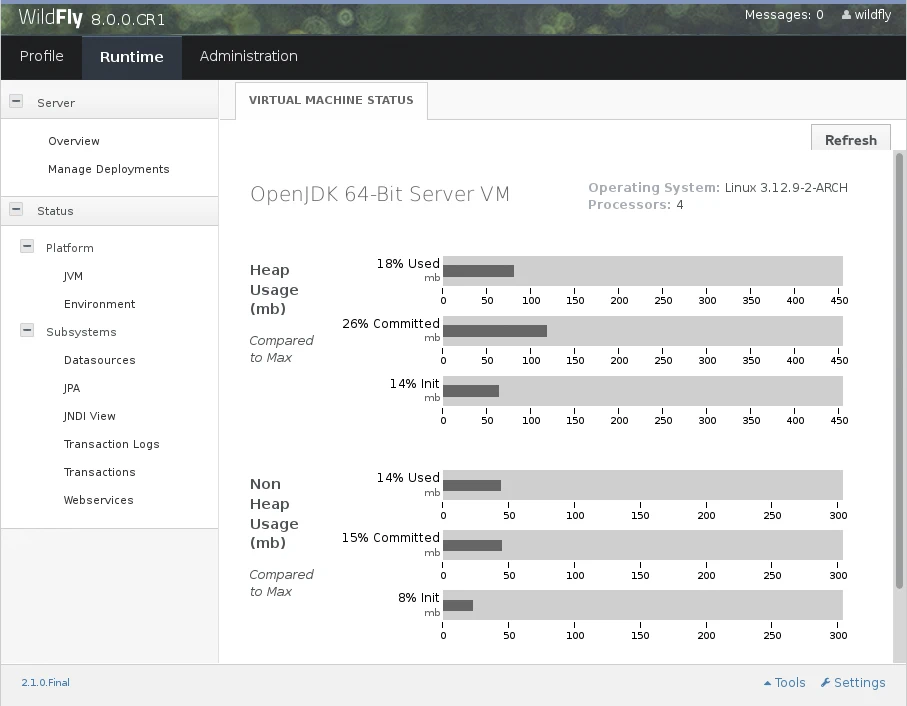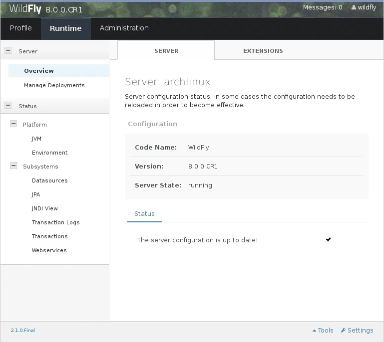 A continuación unas pocas capturas de pantalla de la página de inicio de WildFly y de la consola de administración: