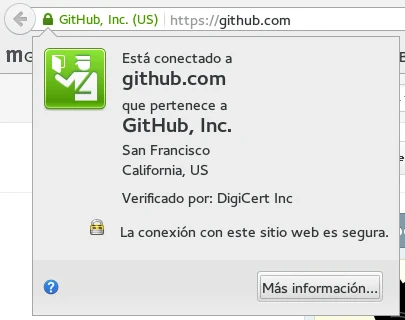 Sin embargo, para proporcionar más seguridad y garantía de que como usuarios nos estamos comunicando con el servidor que creemos sin examinar el certificado algunos certificados permiten mostrar también en la barra de direcciones un recuadro verde con el nombre de la entidad, el recuadro verde que solemos ver también en la barra de direcciones al acceder a algunos dominios y que es proporcionado por certificados de validación extendida.