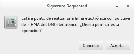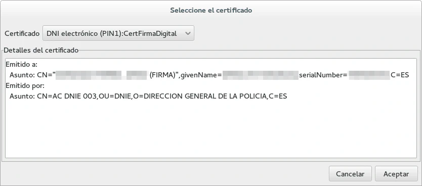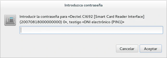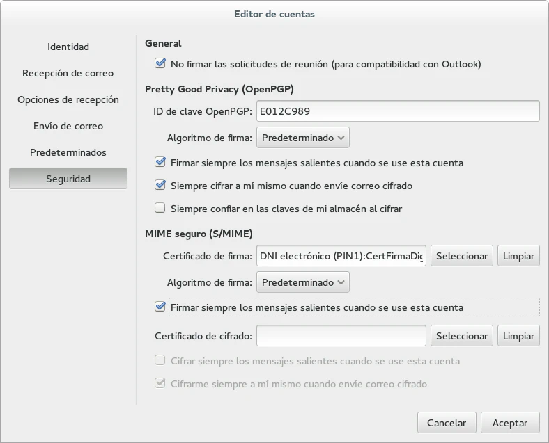 A continuación, el proceso es similar a como se configura la firma con claves GPG, con el lector de tarjetas inteligentes conectado al equipo y el DNI electrónico introducido accedemos a las propiedades de la cuenta, a la sección seguridad y en el apartado MIME seguro (S/MIME) seleccionamos nuestro certificado. Si queremos que nuestros mensajes se firmen automaticamente debemos marcar la opción «Firmar siempre los mensajes salientes cuando se use esta cuenta». Habiendo ejecutado el comando modutil cuando pulsemos el botón seleccionar en el apartado S/MIME se nos solicitará el PIN secreto de nuestro DNIe.