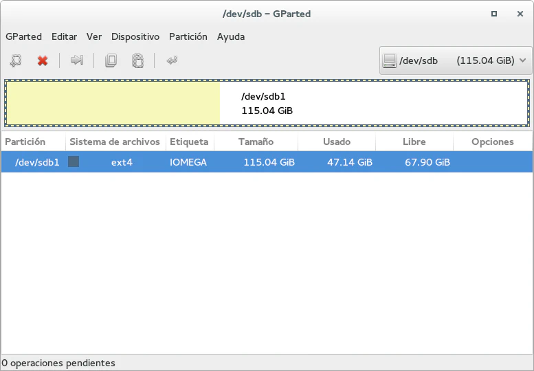 Una vez escrita la imagen muy probablemente deberemos redimensionar la partición para aprovechar todo el espacio de almacenamiento del dispositivo. Con GParted podemos hacerlo de forma muy sencilla. Seleccionamos /dev/sdb1, desmontamos la partición y redimensionamos el espacio para la partición, finalmente pulsamos en la opción «Editar> Aplicar operaciones».