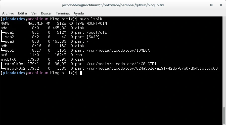 Teniendo instalado en la tarjeta SD tanto la partición de arranque como la partición del sistema donde está realmente la distribución que hayamos instalado necesitaremos mover la partición del sistema a una dispositivo USB. Para ello podemos utilizar el comando dd, deberemos conocer el dispositivo asignado a la tarjeta SD cuando la introduzcamos en el ordenador, para ello podemos usar el comando lsblk: