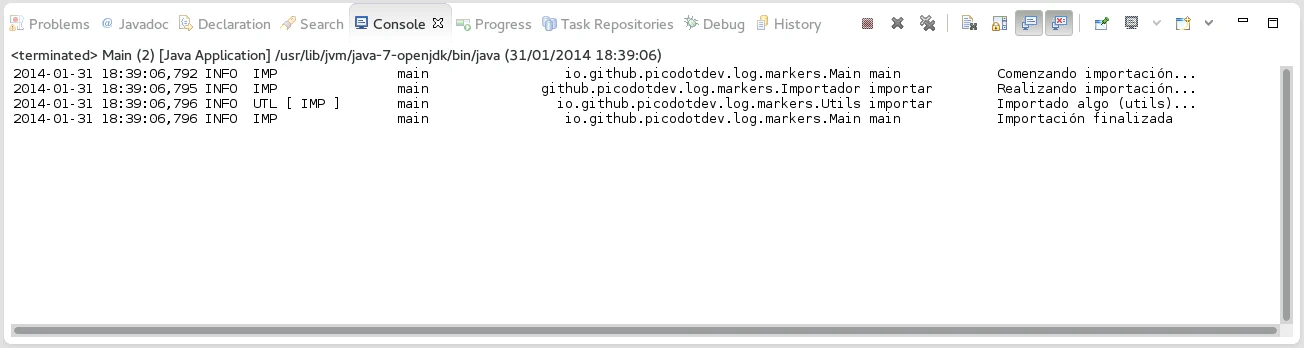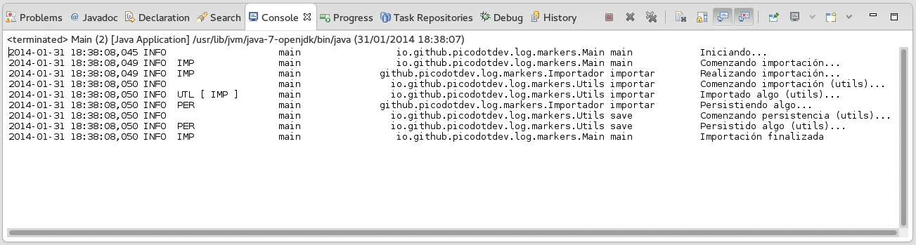 Para conseguir solo las trazas de una funcionalidad se pueden utilizar los marcadores («markers») de forma que además de por el nivel del mensaje de traza y el logger podamos filtrar por el marcador asociado a la traza. El marcador de una traza es una etiqueta por la que posteriormente podemos filtrar. Si una funcionalidad estuviese repartida por varias clases podríamos usar el mismo marcador en todas esas trazas de forma que podamos filtrar luego por él. El resultado del ejemplo completo sería el siguiente: