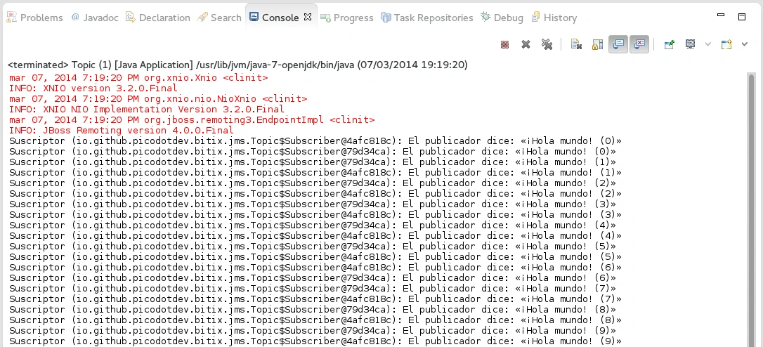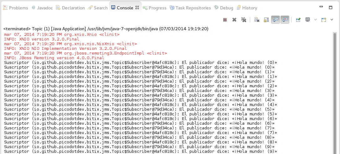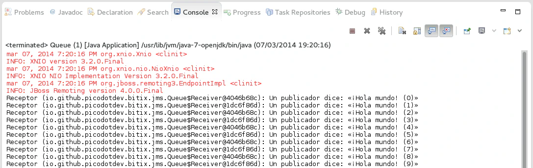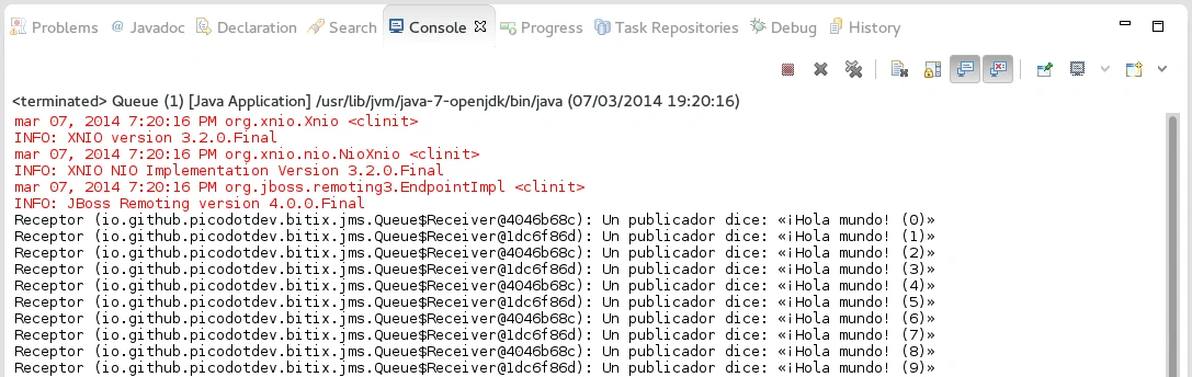 A continuación pondré el código de una sencilla aplicación que se conecta al servicio JMS de un servidor de aplicaciones WildFly de forma remota y envía y recibe unos pocos mensajes de texto.