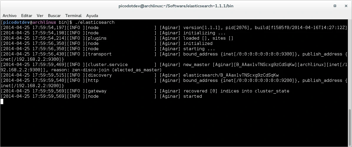 La instalación de ES es muy sencilla, basta con descargar el zip de su distribución, descomprimirlo e iniciarlo con el siguiente comando: