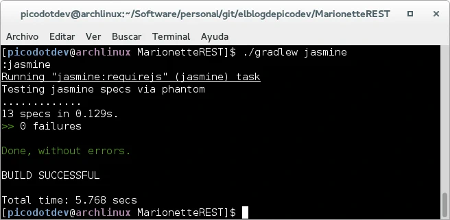 Sin embargo, puede que deseemos ejecutarlas desde la herramienta de construcción que usemos, en mi caso con Gradle. Para añadir el soporte a Gradle de ejecutar las pruebas unitarias a su vez con Grunt debemos añadir la siguiente configuración a nuestro archivo build.gradle: