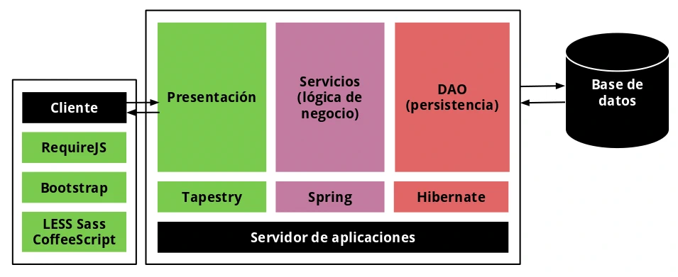 En cuanto a la aplicación y el código Java en si las partes importantes están en un servicio que se encarga de la indexación extrayendo el contenido de las fuentes y guardalo en una base de datos, otro servicio para la generación del contenido del sitio de forma estática (html, css, js, imgs, …) y finalmente el programa Java principal que sirve para lanzarlo desde la linea de comandos, el resto son las clases del modelo de datos y los DAO de persistencia y acceso a dataos. La aplicación sigue el esquema tradicional de 3 capas, la de presentación (páginas y componentes de tapestry), la de lógica de negocio formada por los servicios de indexación, generación y los DAOs (formada por el contenedor de servicios de tapestry y spring) y finalmente la capa de datos formada por una base de datos H2 (donde hibernate interviene). En realidad en BS no hay un servidor de aplicaciones sino que se usa Tapestry en una aplicación «standalone».