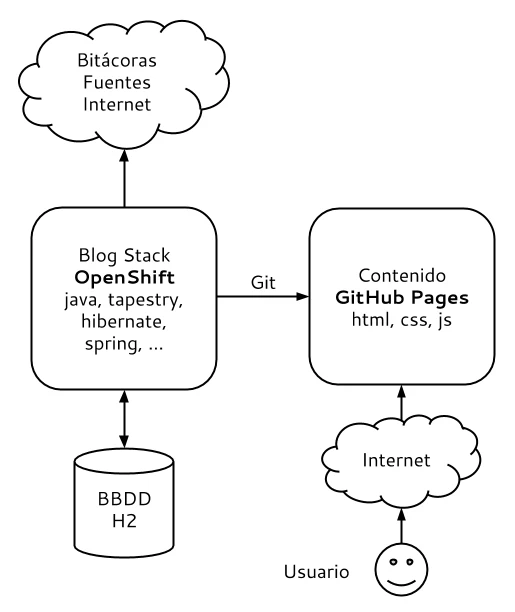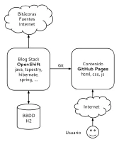 Por otro lado estaba bastante contento con la generación estática de mi bitácora con Octopress y el alojamiento en GitHub Pages. Me pereció que una opción con un coste mínimo podría generar de forma estática el contenido y alojarlo en GitHub Pages al igual que hago con Octopress. Finalmente, me quedaba donde hacer la generación estática, otra opción era usar la Raspberry Pi pero esto me obligaba a mantenerla encendida siempre, cualquier problema en la Raspberry Pi o conexión en mi red o si la necesitaba apagar en algún momento podría dejar BS sin actualizarse. Si era posible necesitaba una forma de nube, por suerte OpenShift ofrece un plan gratuito de 3 gears con 512 MiB de memoria y 1 GiB de espacio en disco cada uno y en las primeras pruebas que hice era suficiente. Además, OpenShift ofrecía todas las herramientas que necesitaba git para subir el contenido estático al repositorio de GitHub, iconv, cron, bases de datos relacionales y no sql, poder usar Undertow como servidor y un «cartridge» diy («Do It Yourself»). Tenía varias piezas, finalmente elegí la combinación de OpenShift para la generación estática y GitHub Pages para servir el contenido. El contenido podría servirlo desde OpenShift pero no estaba seguro de que el gear fuese capaz de aguantarlo todo si el tráfico fuese grande. Por el espacio en disco de 1 GB tenía dudas de cuanto podría necesitar pero si fuera mucho podría adquirir 1 GiB adicionar por 1 € al mes.