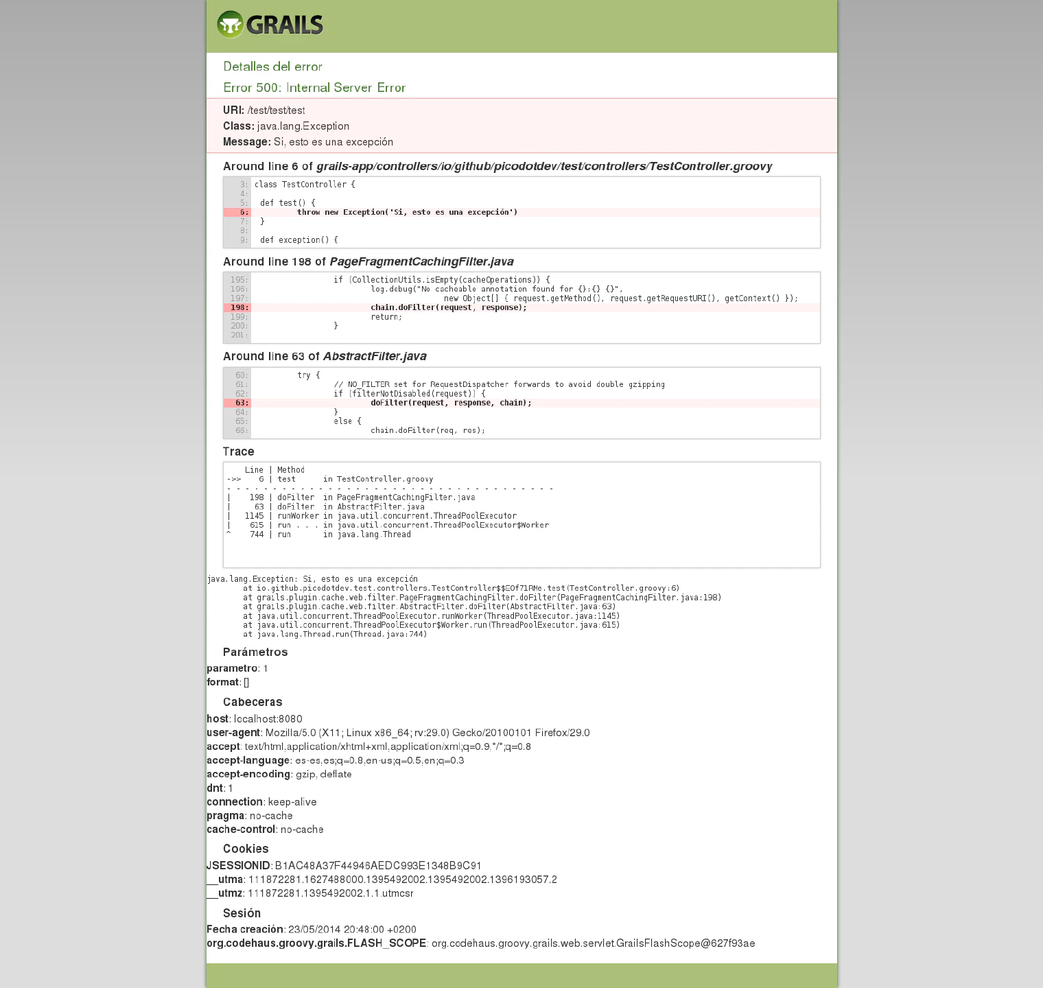 En este artículo crearé una página de excepción para Grails con los parámetros de la petición y sesión, cabeceras HTTP y las cookies enviadas además de la traza de la excepción. Los parámetros, las cookies y cabeceras HTTP se pueden obtener de la request y los atributos de la sesión del objeto session. El código del ejemplo de página de excepción es el siguiente.