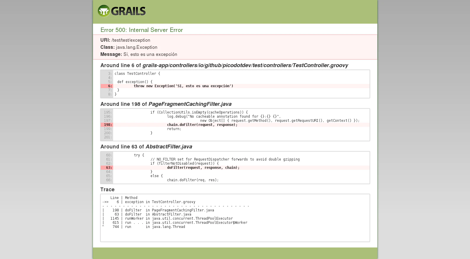 La página de error de Grails por defecto da poca información, a poco más da la traza de la excepción y un extracto de los archivos relacionados donde se ha producido, podría ser mejor. Podría informar de los parámetros que se enviaron en la petición, las cabeceras http o las cookies además de los parámetros de sesión, a veces esta información nos puede servir para identificar la causa más rápidamente ya que la excepción puede estar produciéndose con el valor de un determinado parámetro o un determinado navegador, esta información no la tenemos en una simple traza de la excepción.