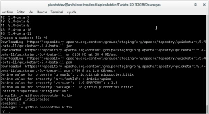 El comando nos presentará un montón de arquetipos, el propio de Tapestry se corresponde con una opción que deberemos buscar, org.apache.tapestry:quickstart. Además, del arquetipo a usar se nos pedirá el grupo de la aplicación y nombre de artefacto, para el ejemplo usaré como grupo io.github.picodotdev.bitix y como nombre de artefacto inicio rápido. También nos pedirá la versión y finalmente el paquete de las clases, podemos dejar las opciones por defecto.