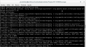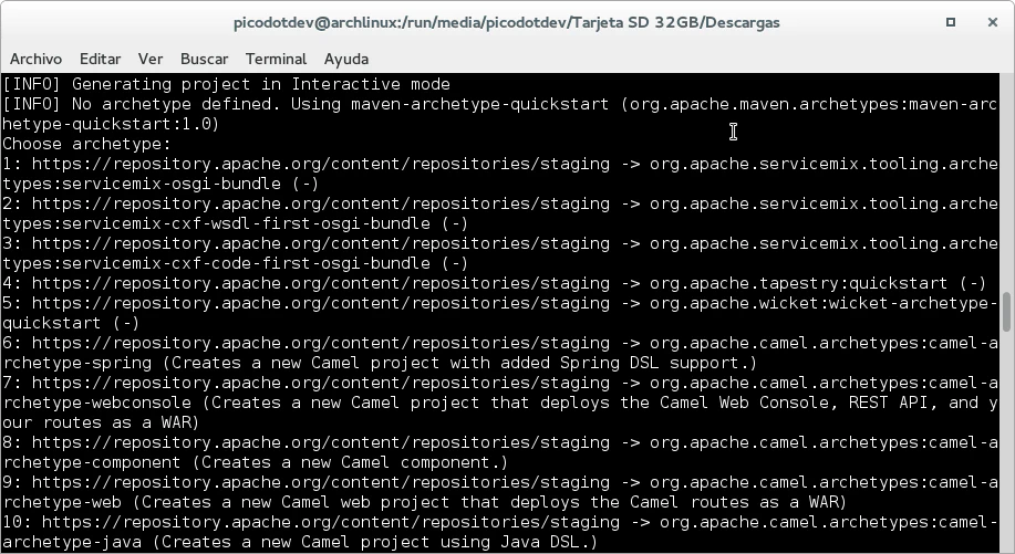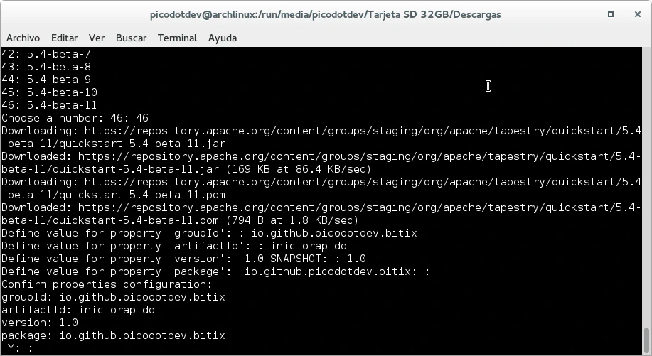 El comando nos presentará un montón de arquetipos, el propio de Tapestry se corresponde con una opción que deberemos buscar, org.apache.tapestry:quickstart. Además, del arquetipo a usar se nos pedirá el grupo de la aplicación y nombre de artefacto, para el ejemplo usaré como grupo io.github.picodotdev.bitix y como nombre de artefacto inicio rápido. También nos pedirá la versión y finalmente el paquete de las clases, podemos dejar las opciones por defecto.