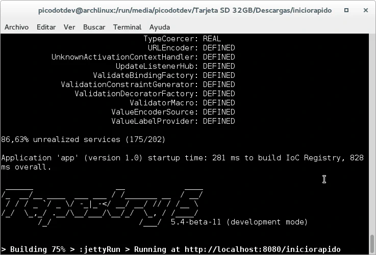 Una vez generada la aplicación podemos iniciarla con un servidor embebido Jetty con la aplicación desplegada en él ya usando Gradle: