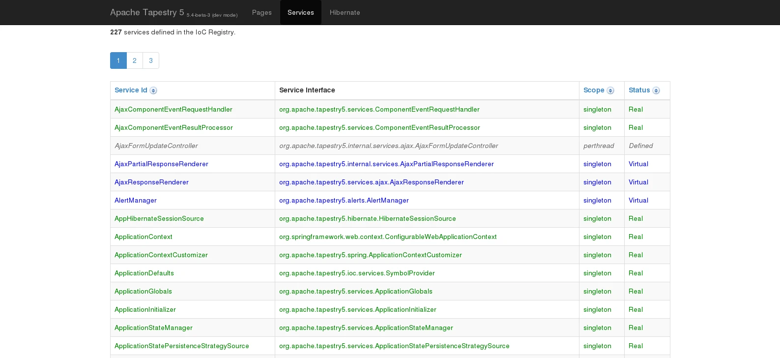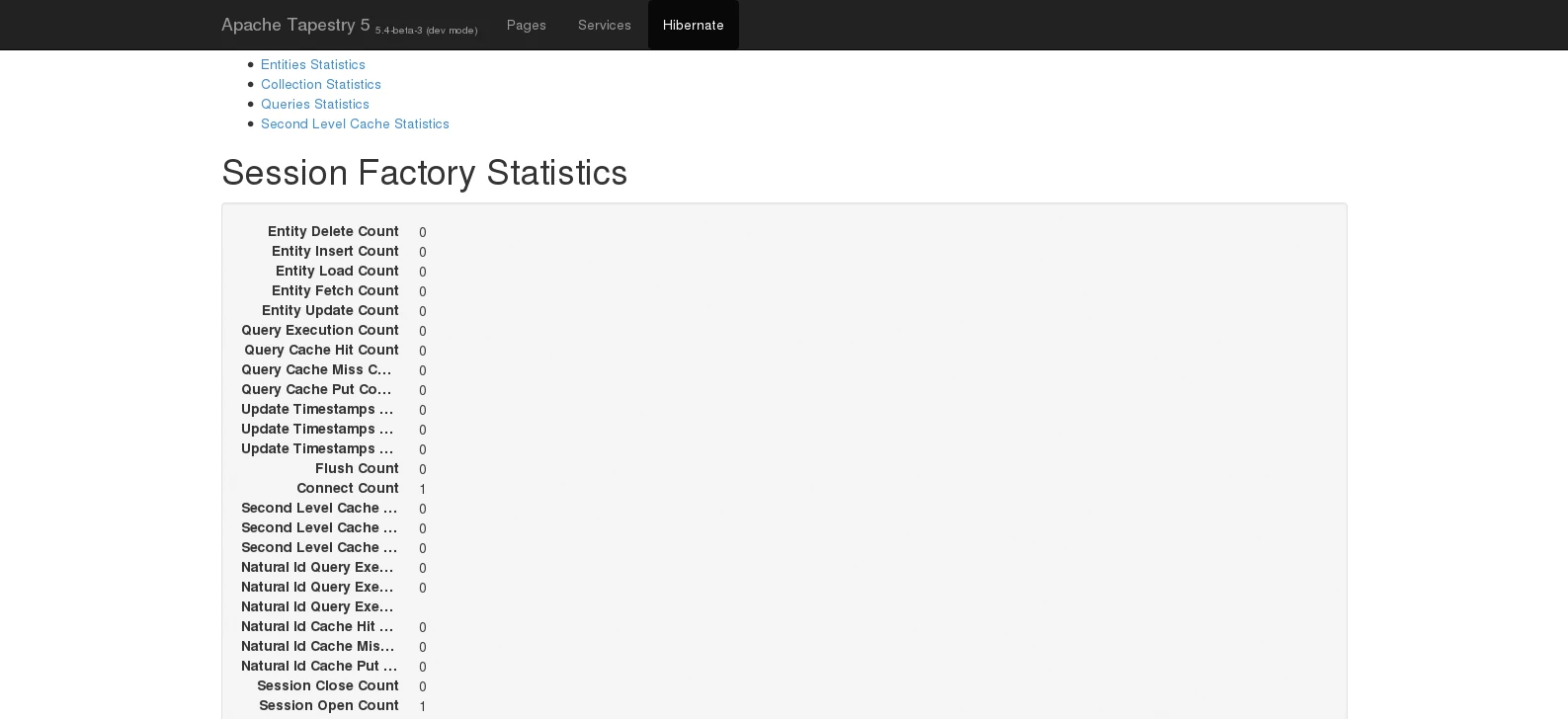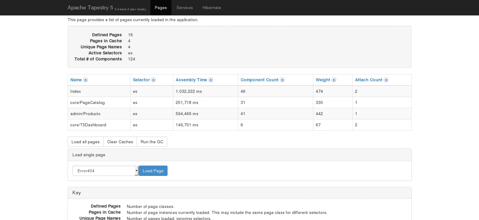 Con la versión 5.4 de Tapestry las páginas PageCatalog, ServiceStatus e HibernateStaticstis han sido unificadas en la página T5Dashboard por lo que ahora en una sóla página tendremos toda la información. Una de las características más importantes de Tapestry es ser muy informativo proporcionando mucha y descriptiva información, esto se nota con la página de informe de error incluso para las peticiones ajax, los mensajes de logging y con estás páginas de información de estado.