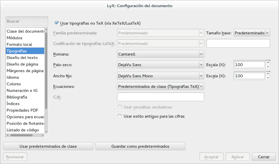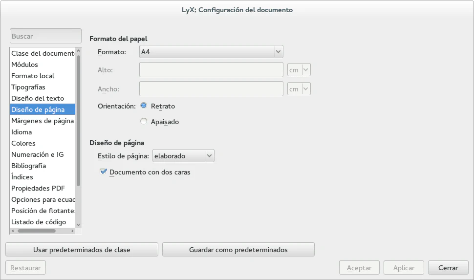 Una de las primeras cosas que deberemos hacer es indicarle a LyX la clase de documento que pretendemos escribir a partir del cual se establecerán los estilos y opciones que LyX nos ofrecerá, también las secciones que dispondremos. Con la clase de documento book tendremos secciones numeradas y no numeradas, la diferencia es que además de unas tener numeración y otras no es que las numeradas aparecerán en el índice y las no numeradas no. Para ello seleccionamos Documento> Configuración.