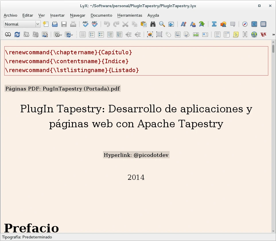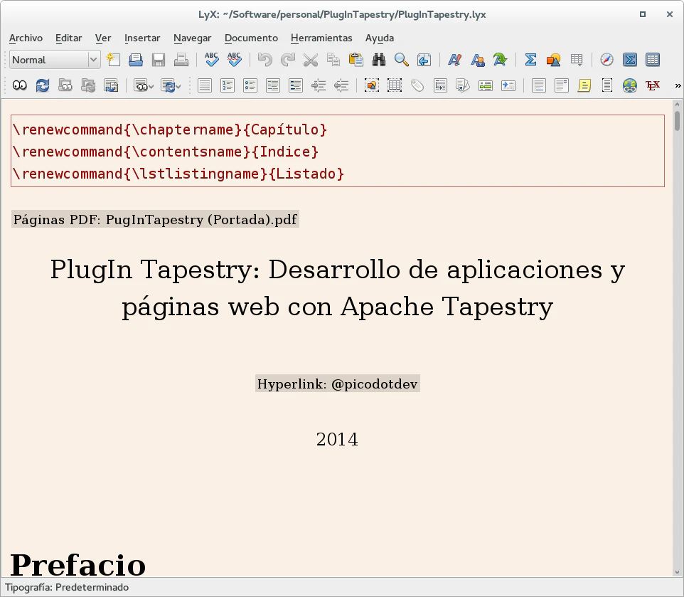 Hace unos días publiqué una nueva edición del libro PlugIn Tapestry, sobre el framework Apache Tapestry para el desarrollo de páginas y aplicaciones web con Java. En este artículo quiero recoger las herramientas que utilicé para escribirlo y algunas cosas básicas a conocer para tener un libro con un aspecto decente y más profesional. Son cosas muy básicas pero que a mi me costo un poco poco encontrarlas para conseguir lo que quería, quizá a alguien le sirvan.