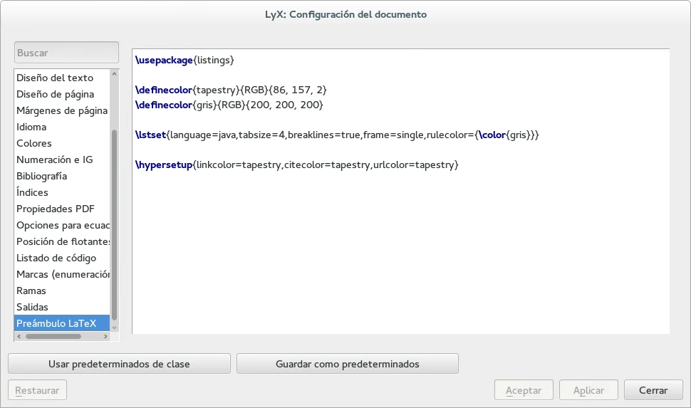 Entre las mismas opciones podemos seleccionar las tipografías, el diseño de la página (A4, A5, …), los márgenes y una parte importe donde podremos modificar varios aspectos del documento, el preámbulo LaTeX, lo difícil de esta sección es saber cuales son las opciones podemos escribir en él pero si necesitamos modificar algo probablemente debamos insertarlo en esta sección. Un posible contenido es el siguiente donde defino y modifico el color de los hiperenlaces del libro y las opciones por defecto de los listados.