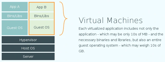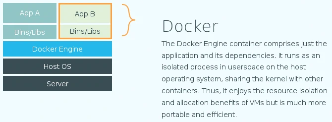 Al contrario de la virtualización Docker no emula o virtualiza una máquina y su sistema operativo con lo que los procesos son mucho más ligeros y hace que el hardware pueda ser aprovechado más al poder aumentar la densidad de los servicios en una misma máquina. Los contenedores y servicios incluidos en ellos inician muy rápidamente, en pocos segundos. Además, no es necesario el sistema de archivos completo del sistema operativo invitado con lo que docker usa una fracción de espacio de almacenamiento necesario en la virtualización.