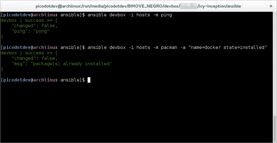 Pero en vez de usar Ansible mediante comandos podemos emplear recetas contenidas en playbooks descritos en formato YAML en las que definimos varias tareas y podemos usar las variables del inventario. Con el siguiente playbook instalamos varios paquetes en una máquina Arch Linux y hacemos un checkout de dos proyectos de subversion, para ello usamos en la primera tarea el módulo para gestionar paquetes con pacman, hay módulos para los gestores de paquetes de otras distribuciones (apt, yum, …) y en la segunda tarea hacemos un checkout de dos proyectos usando el módulo del sistema de control de versiones subversion. Los módulos son idempotentes de forma que una vez que el sistema está en el estado deseado no se realiza la operación, esto hace que el mismo playbook pueda ser ejecutado tantas veces como se desee evitando efectos colaterales por reejecuciones, lo importante es el estado que se quiere conseguir, Ansible se encarga de realizar las acciones necesarias para llegar a él desde el estado actual del sistema.