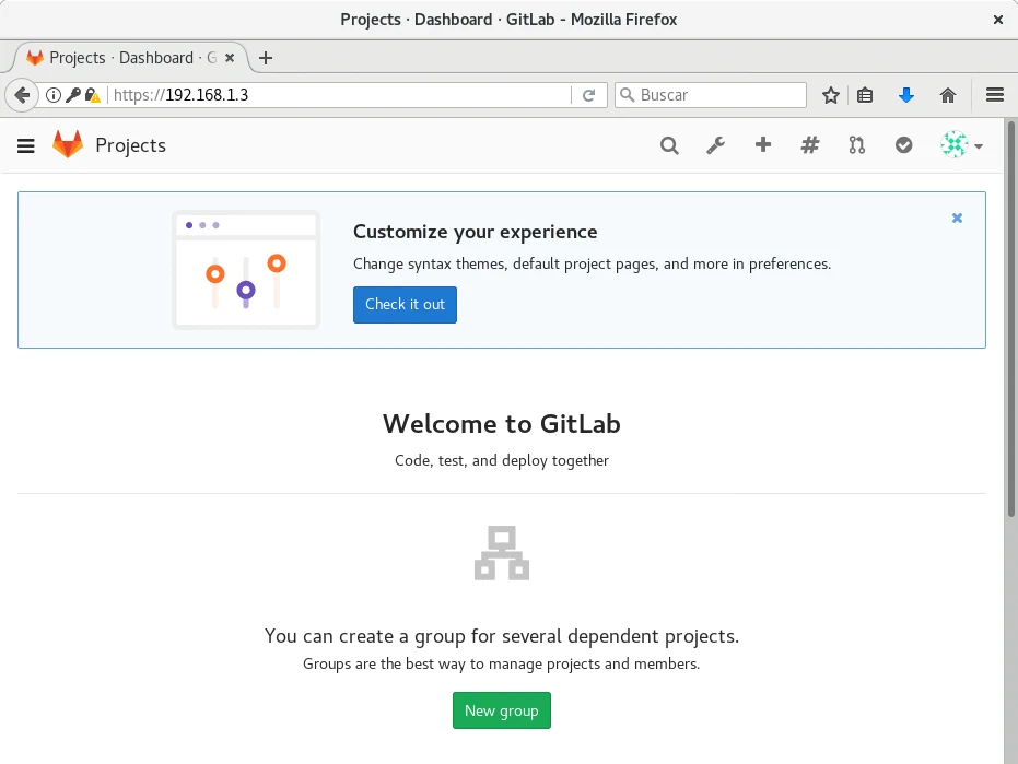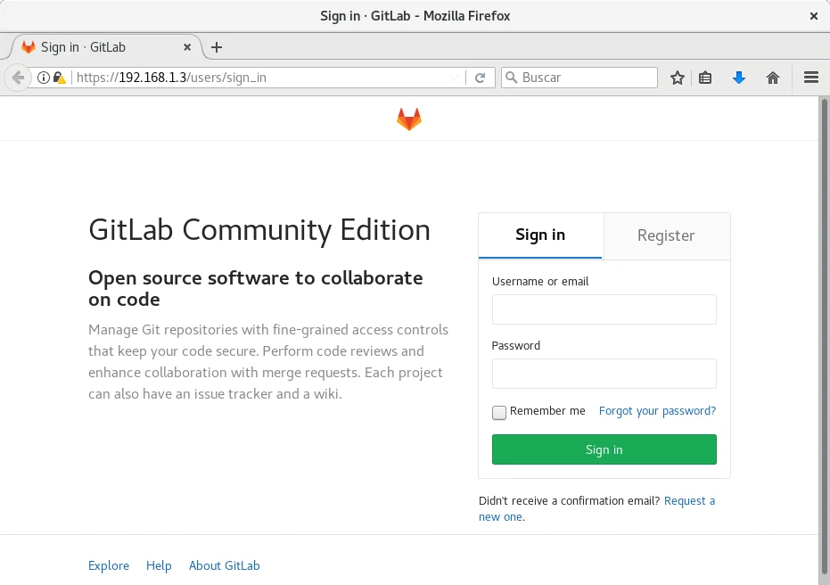 Accediendo con el navegador a la dirección https://192.168.1.3 se accede a la aplicación de GitLab que pide un usuario y contraseña para iniciar sesión, el usuario y contraseña están indicados en la página de descarga de la imagen del servicio.