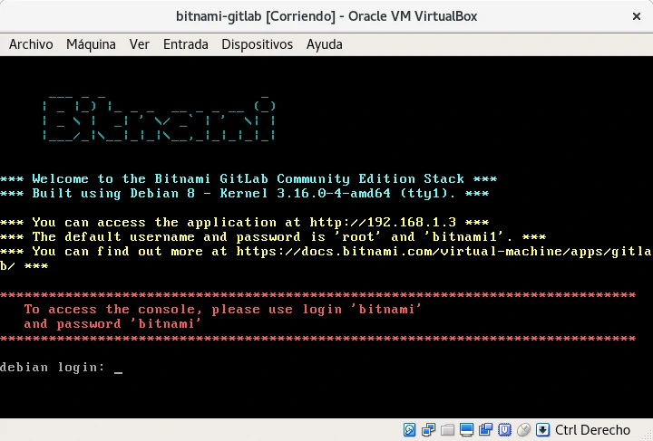 Una vez importado el servicio y creada la máquina virtual la tratamos como cualquier otra máquina virtual para iniciarla la máquina virtual está lista para ser iniciada. Una vez iniciada completamente en la terminal se solicita un inicio de sesión con el usuario y contraseña que da acceso a una terminal para realizar tareas administrativas, en la misma página de inicio de sesión se indica el usuario y contraseña a usar y se indica la dirección IP (en el caso de las capturas mostradas es la 192.168.1.3) que es necesario usar para acceder al servicio con el navegador. En el primer inicio de sesión se solicita cambiar la contraseña.