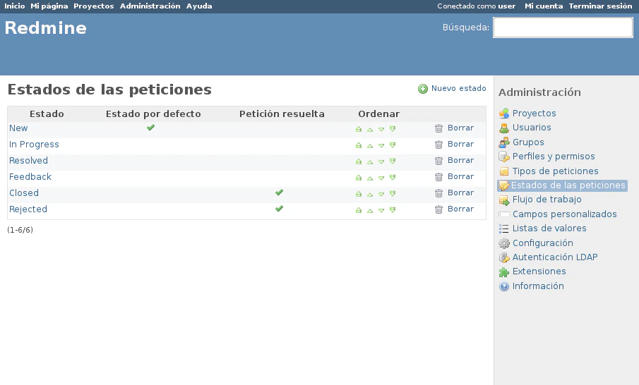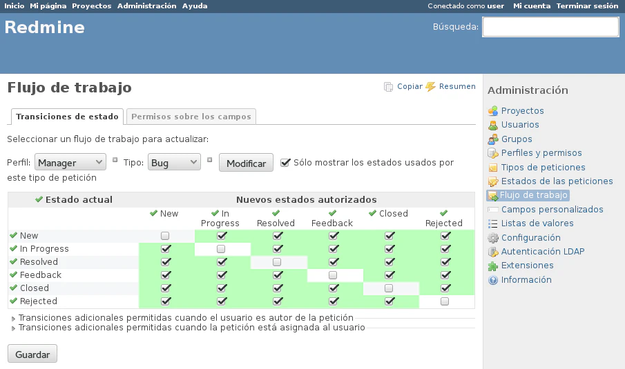 Con Redmine podemos adaptar el flujo de las tareas a la forma de organización que empleemos, podemos personalizar el grafo de estados que siguen las tareas y que personas tiene permisos para hacer cada uno de los cambios de estado. También podemos añadir campos personalizados que queremos recoger para cada petición, por ejemplo, podemos querer dar un tamaño a las tareas en función de si estimamos que es grande, media o pequeña. También podemos crear filtros y guardarlos para encontrar fácilmente tareas.