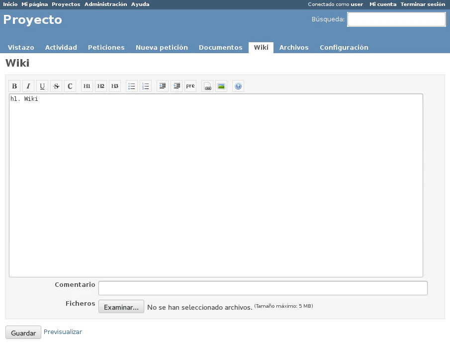Además de gestionar las tareas Redmine dispone de herramientas que nos pueden ser útiles en el proyecto como una wiki para recoger documentación del proyecto y un repositorio de documentos para aquellos que no queremos incluir en la herramienta de control de versiones por su tamaño pero que queremos que estén disponibles para cualquiera que trabaje con el proyecto.