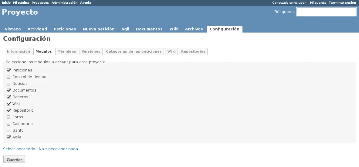 Finalmente, debemos activar el plugin agile en el proyecto usando la opción Administration> Agile.