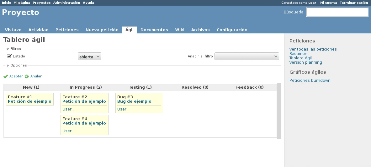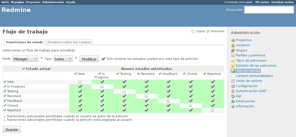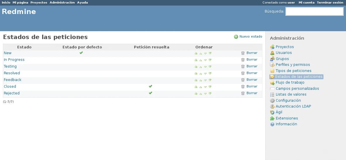 Una vez activado ya podemos ver el panel kanban mostrado en la primera captura en la pestaña ágil. Por defecto en Redmine solo veremos las columnas New, In progress, Resolved y Feedback pero podemos modificar el flujo de las peticiones adaptándolo a nuestra metodología u organización, podemos hacer esto desde Administración> Estados de peticiones para crear nuevos estados y Administración> Flujo de trabajo para establecer el grafo de estados determinando a que estados puede cambiar una petición desde su estado actual.
