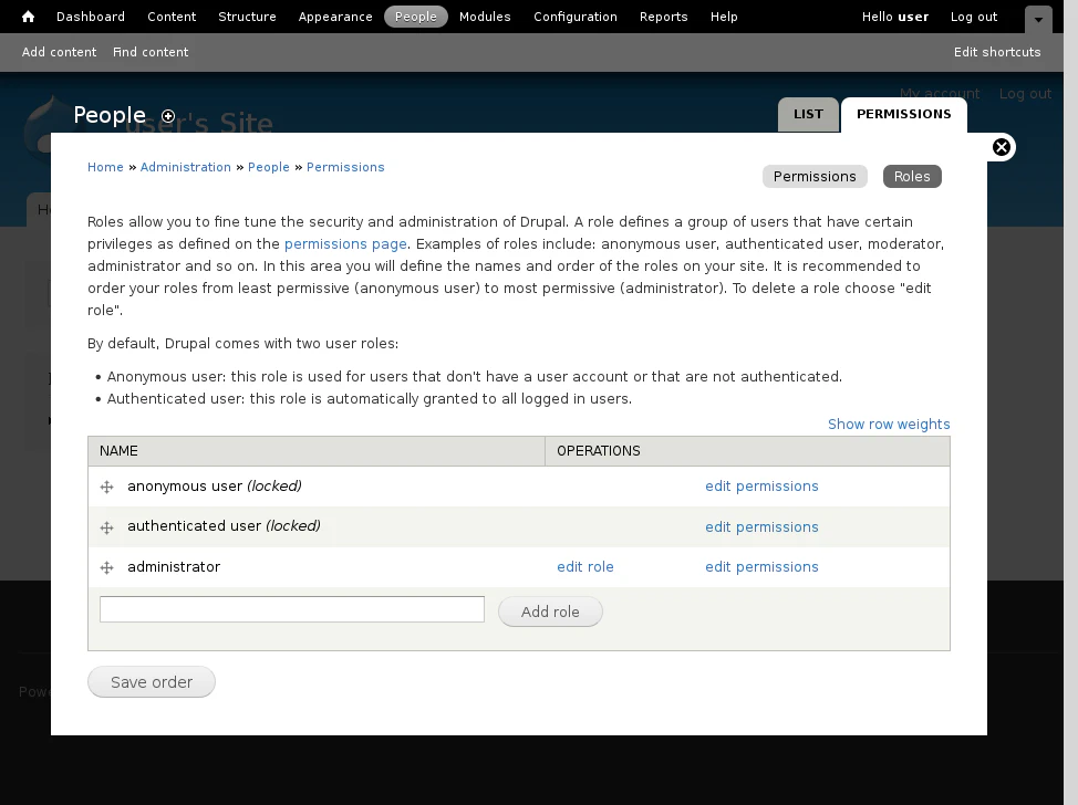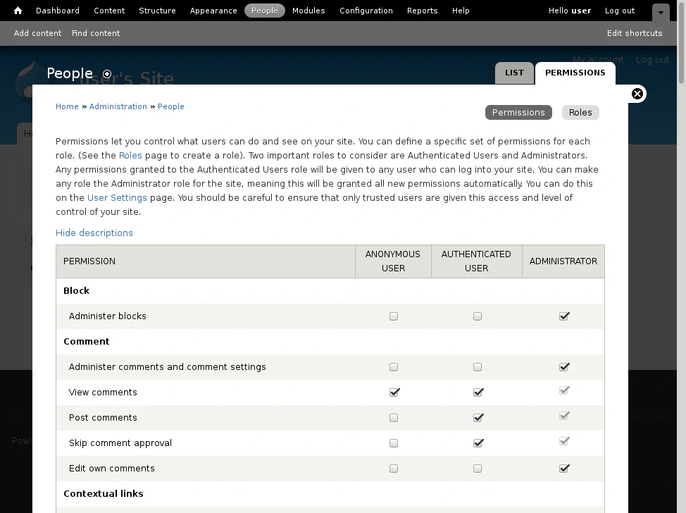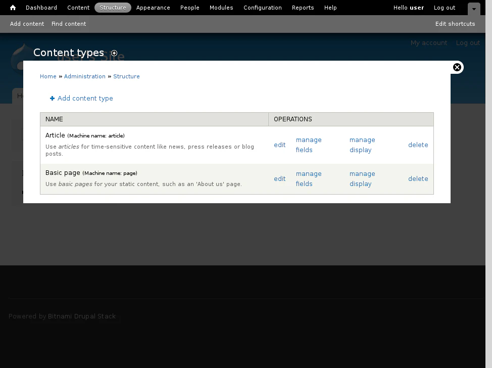 Por defecto Drupal ofrece dos tipos de contenido páginas y artículos que poseen un título y un cuerpo aunque podemos crear nuevos tipos de contenido con información adicional como podría ser eventos que recojan además una fecha y hora de inicio, fecha y hora de fin, lugar, …. Podemos crear usuarios y roles y asignarles permisos como poder crear contenidos, crear menús con enlaces a ciertos contenidos que queramos destacar. Podemos usar taxonomía para categorizar el contenido y que este esté organizado y sea fácilmente encontrado por los usuarios. Asociar tipos de contenido con ciertos tipo de taxonomía. Modificar los bloques como menús, formulario de inicio de sesión, … y hacer que solo se vean en ciertas páginas, para algunos tipos de contenidos, ciertos roles o usuarios. Hacer vistas o listas de los contenidos. Modificar la disposición o layout de las páginas por ejemplo para que tenga dos, tres columnas, una cabecera y un pie, …. Finalmente también podemos modificar y personalizar el aspecto del sitio web con temas que podemos descargar o desarrollar nosotros mismos.