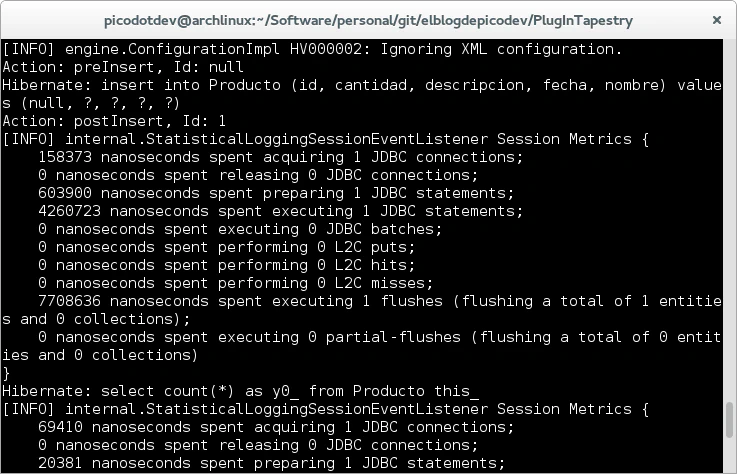 Con esto ya recibiremos los eventos cuando ocurran. En el ejemplo aparecerá en la consola los mensajes cuando se inserte, actualice o elimine una fila de base de datos. En las capturas de imagen se muestran las trazas de una inserción, una traza para la preinseción Action: preInsert, Id: null donde se ve que la entidad no tienen identificativo asignado y otra traza después de la inserción Action: postInsert, Id: 1 donde la entidad ya tiene identificativo asignado y la sentencia SQL se ha ejecutado, como se ve en la captura los mensajes salen antes y después de ejecutarse la sentencia SQL que se envía a la base de datos.