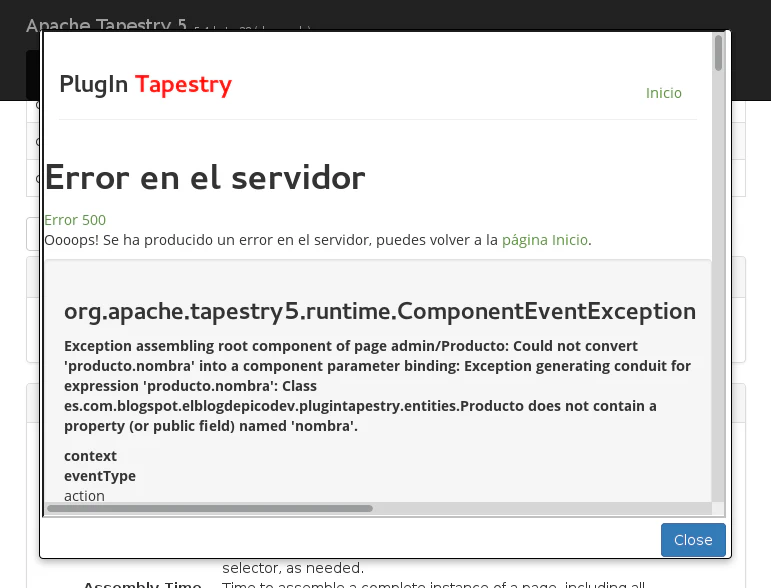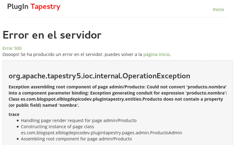 En la imagen con el mensaje del error se puede ver de forma muy detallada cual es la causa, nos indica que el error está en la página admin/Producto y que la clase es.com.blogspot.elblogdepicodev.plugintapestry.Producto no tiene una propiedad llamada nombra, con este mensaje rápidamente nos damos cuenta del error de escritura que hemos cometido, corregirlo basta con sustituir nombra por nombre y pulsando de nuevo el botón Load all pages comprobamos que no hay más errores en esa misma página o ninguna otra de la aplicación.
