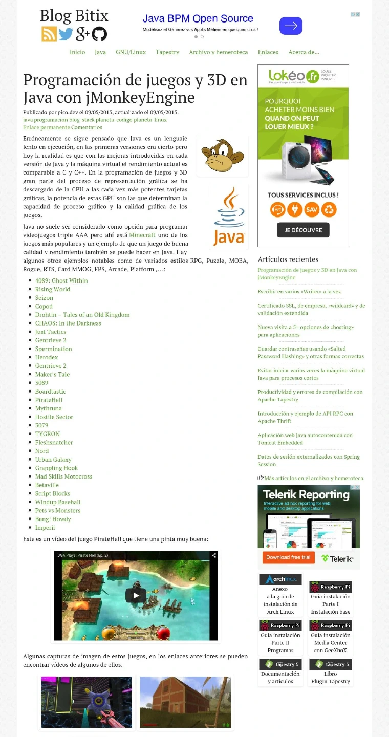 Entre las cosas de diseño que quería cambiar estaba la cabecera intentando que fuese pequeña verticalmente para que según se cargue la página se vea la mayor parte posible de contenido, con esto he quitado la descripción de la bitácora de la cabecera y la he puesto en el pié de página. En el menú he puesto enlaces a las secciones de las que suelo hablar: Java, GNU/Linux, JavaScript y Apache Tapestry. Los usuarios podrán encontrar más fácilmente el contenido de los temas principales que escribo y quizá Google averigüe un poco mejor de que trata la bitácora. Entre otras cosas he cambiado el tema a uno basado en el color blanco, reorganizado los bloques de anuncios de publicidad Adsense, eliminado Karmacracy por nulo uso para compartir contenido y dejando solo Share This para este propósito, he situado los enlaces de sindicación al lado del logotipo para darles más visibilidad, cambiada la visualización de los thumbnails de las imágenes ahora se podrán ver en un tamaño mucho más grande y mejor, la página de inicio ahora solo incluye un resumen de los artículos en vez del artículo completo con lo que espero que esta página se cargue mucho más rápido, un fondo que varía de forma aleatoria en cada carga de página (lo mismo que hago en Blog Stack), añadidos algunos estilos para poner pies en las imágenes y algunas correcciones y modificaciones más en el pie y en la barra lateral.