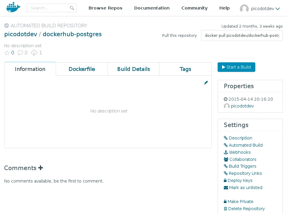 Una vez que tenemos el repositorio de GitHub subimos un Dockerfile para el ejemplo, usaré el proporcionado de forma oficial de posgresql, y creamos en Docker Hub una build automatizada, se nos solicitará permisos en la cuenta de GitHub para que Docker Hub pueda acceder a nuestros repositorios.