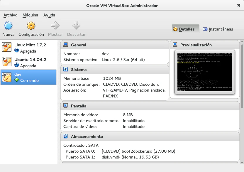 En el administrador de VirtualBox veremos que se ha creado la máquina virtual dev además de poder cambiar la configuración de memoria y otros parámetros de la máquina virtual.