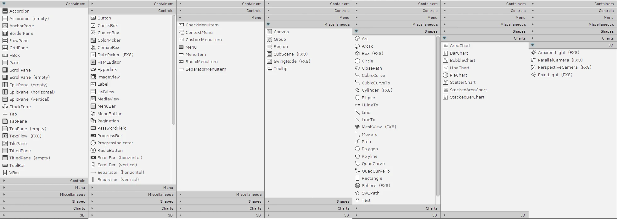 En la aplicación JavaFX Scene Builder disponemos de una amplia paleta de controles que podemos usar arrastrando y soltando para construir la interfaz, botones, checkbox, radio buttons, paneles, rejillas, menús, contenedores, miscelánea, formas, 3D, …