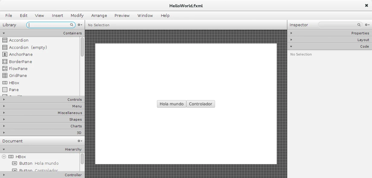 Con los archivos FXML que genera la aplicación JavaFX Scene Builder crear aplicaciones gráficas es mucho más sencillo y más fácilmente mantenible. Proporciona un editor que sigue el principio lo que ves es lo que obtienes (WYSIWYG) y que permite generar los archivos FXML que posteriormente se pueden utilizar en la aplicación Java de escritorio para crear la interfaz visual. Podemos descargar la aplicación JavaFX Scene Builder desde su página de descargas. En la siguiente imagen se puede ver la interfaz con el ejemplo Hola Mundo.