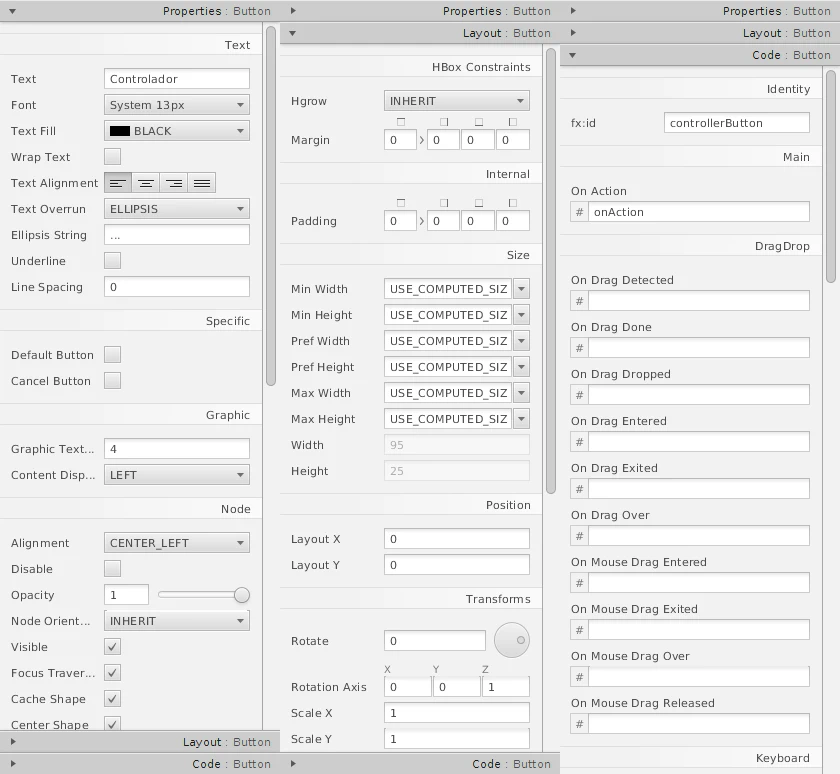 La clase manejador de eventos se indica en el panel Controller y es una clase con métodos que posteriormente se indican en el editor con una almohadilla (#) delante en el panel Code. Por ejemplo, si el manejador de un botón se llama onClick en la clase controlador HelloWorldFXMLController deberemos tener ese método con el parámetro adecuado en este caso un ActionEvent.