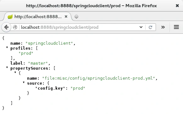 Este sería el inicio del servidor de configuración y el documento JSON que devuelve para la aplicación springcloudclient para el entorno prod en una petición HTTP.