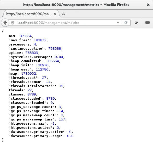 Las métricas ofrecidas en el endpoint metrics por Spring Boot Actuator muestran información del sistema (memoria total, procesadores, tipo de inicio de aplicación y sistema, carga media, memoria usada, threads, clases cargadas y información del recolector de basura de Java), información de los datasource (número de conexiones establecidas y uso actual), métricas de las caches, usando Tomcat de las sesiones (actuales y máximas). Haciendo uso de los servicios de Spring CounterService y GaugeService se pueden establecer métricas relativas y absolutas en cualquier punto de la aplicación con la lógica que deseemos.