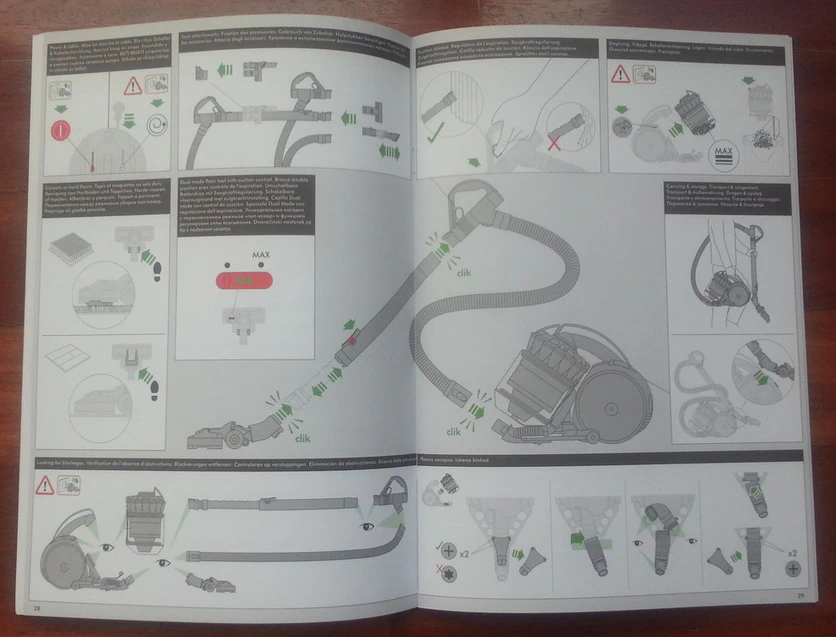 Por poner algún defecto después de usarla diré que no se puede guardar de forma vertical por su forma de cuerpo y bola, sus dimensiones son de unos 51cm de ancho x 31cm de alto x 26cm fondo mirada desde un lateral algo más grande que otras aspiradoras como la Rowenta que comentaba anteriormente. El gatillo es muy cómodo pero en caso de querer tenerlo constantemente abierto para disminuir la succión en el accesorio puede ser cansino, no tiene una posición para dejarlo abierto sin usar el gatillo de la manguera. Este modelo realmente incorpora más accesorios que los indicados en la caja por lo que realmente no debería ser un defecto, en las fotos se ve uno multifunción para esquinas embalados en una bolsa. Usando el accesorio de suelos duros y parquet se une al tubo usando un mecanismo que me queda justo a la altura de una tabla de una cama con lo que al aspirar por debajo de ella si no tengo cuidado choca con el mecanismo de liberación y el accesorio se desengancha, el mecanismo podría estar colocado en un lateral o en la parte de atrás y esto se evitaría. Aún con esto para mí estas cosas no hacen desmerecer la aspiradora.