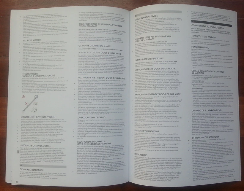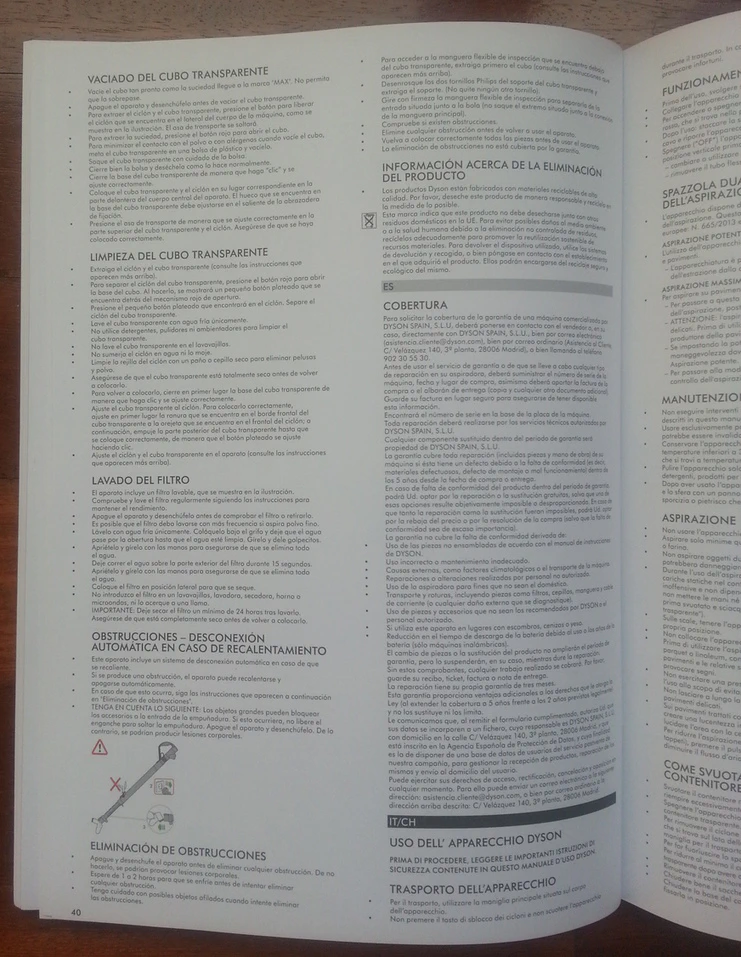 Ya en casa leyendo el manual de instrucciones me percaté de que aunque muchas aspiradoras son sin bolsa y por tanto no hay que cambiarla porque no tienen en vez de eso hay que cambiar el filtro HEPA y el filtro premotor que recogen las partículas más diminutas de polvo, según el fabricante cada año. Además, como es habitual cada fabricante usa sus propios recambios incompatibles con otras marcas y como en este caso es difícil encontrarlos y si es así a un precio de entre 15 € y 30 €. Por lo que solicité hacer la devolución, dentro del plazo dispuesto a tal efecto hay que decir que la persona que me atendió Media Markt no me puso ningún tipo de objeción aún habiendo abierto el paquete que por supuesto volví a embalar como originalmente y en perfecto estado.