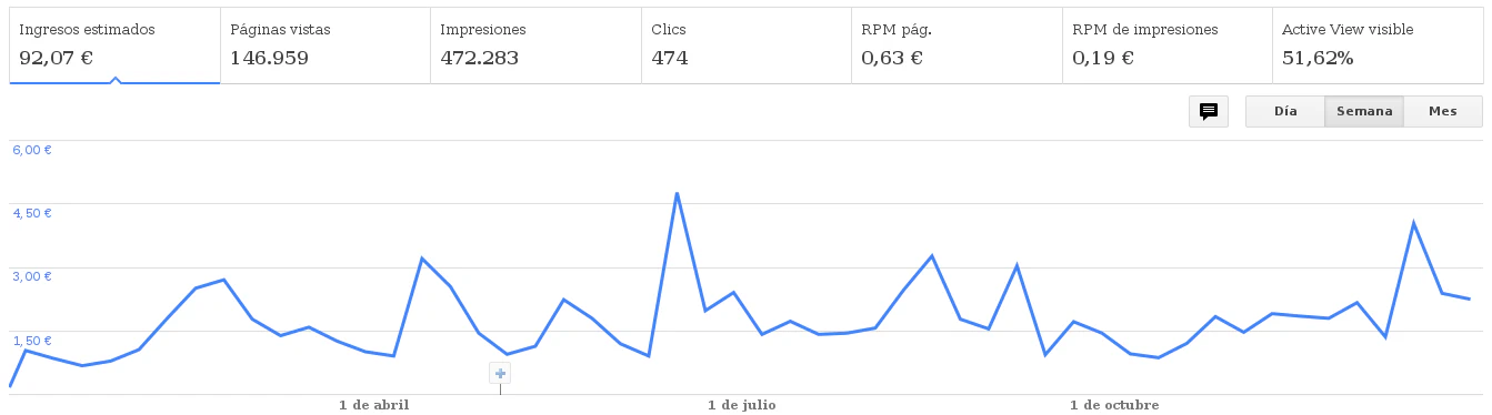 El blog ha seguido creciendo un poco en cuanto a visitas a base de un esfuerzo tremendo tratando de escribir y publicar artículos con cierta calidad, los ingresos por publicidad AdSense siguen siendo prácticamente los mismos, entre 6 y 11 € al mes, como el alojamiento y el dominio me es gratuito es suficiente para hacer alguna donación a un proyecto relacionado con el software libre por lo que tú visitando este blog en cierta forma también podrás sentirte contribuidor del software libre ya uses productos Microsoft o Apple. Una de las cosas que dicen para aumentar visitas es casi más importante la cantidad que la calidad pero no puedo dedicar más tiempo a escribir así que opto por que lo que escriba no esté ya en varios otros cientos de sitios para alguien con el mismo interés le resulte aprovechable, además trato de que los artículos incluyan un ejemplo funcional con su código fuente completo que se pueda probar de manera simple descargándolo.