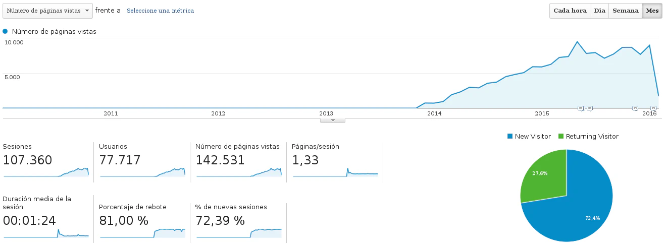 Seis años publicando un artículo semanalmente y algunas semanas incluso dos requiere mucha constancia además de dedicación y ganas, muchas bitácoras son abandonadas en un periodo de tiempo mucho menor. Por el momento dispongo del tiempo, la motivación, ideas y artículos ya escritos pero pendientes de publicar así que por el momento esta bitácora tiene la misma o incluso mejor salud que cuando empecé en el año 2010. Voy apuntando más ideas de las que incluso puedo ir escribiendo, el factor más limitante es el tiempo sobre todo por tener que compaginarlo con la jornada laboral que es lo que realmente me permite tener un sueldo a final de mes motivo por el cual suelo publicar durante el fin de semana y normalmente un solo artículo. Dado que ahora en algunos artículos incluyo vídeos de Asciinema y los que llevan código los subo a mi repositorio de ejemplos de GitHub me lleva algo de ese tiempo que me ahorro en la edición.
