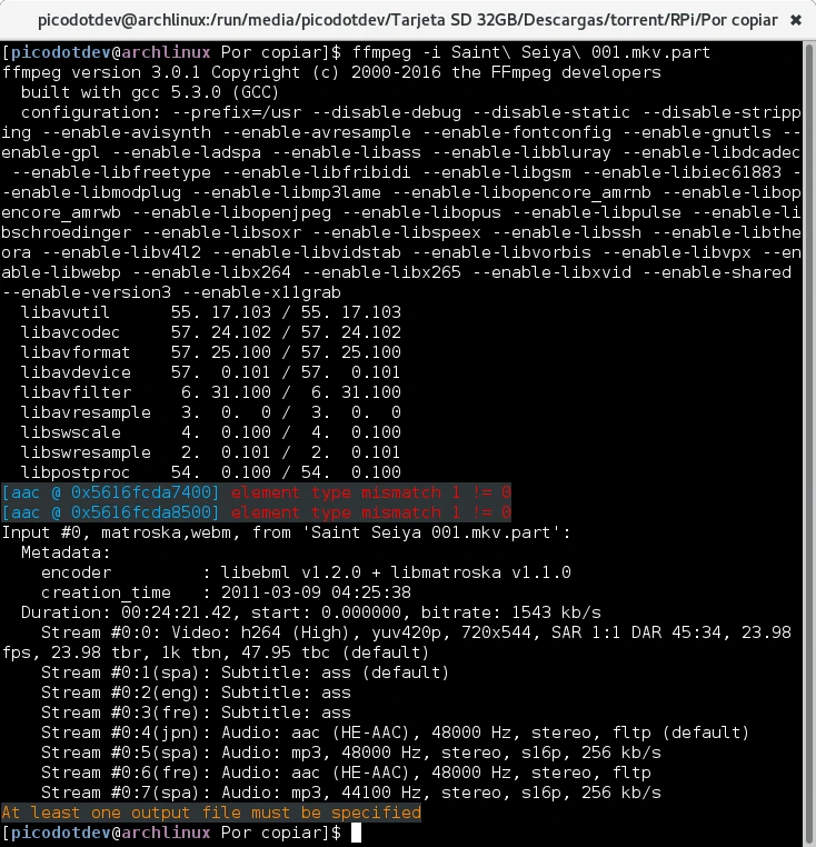 Por otro lado, los vídeos pueden tener múltiples pistas de audio y subtítulos en varios idiomas, para reducir el tamaño del archivo podemos eliminar las pistas de los idiomas que no queramos. Por ejemplo, el siguiente vídeo contiene tres pistas de subtítulos en los idiomas español, inglés y francés y cuatro pistas de audio en japonés, español, francés y español latinoamericano, el siguiente comando nos da información de las pistas o streams en la parte final.