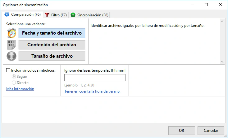 - Opciones de comparación. Donde podremos indicar como detectar cambios entre los archivos, por fecha y tamaño, por contenido o por tamaño del archivo.