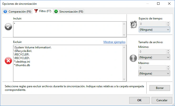 - Opciones de filtrado. Con expresiones regulares indicamos los archivos a incluir y excluir en la sincronización, por ejemplo, *.jpg para fotos, *.docx para documentos de Microsoft Word, … normalmente querremos seleccionar por extensión del archivo. También podremos excluir según el tamaño mínimo, máximo.